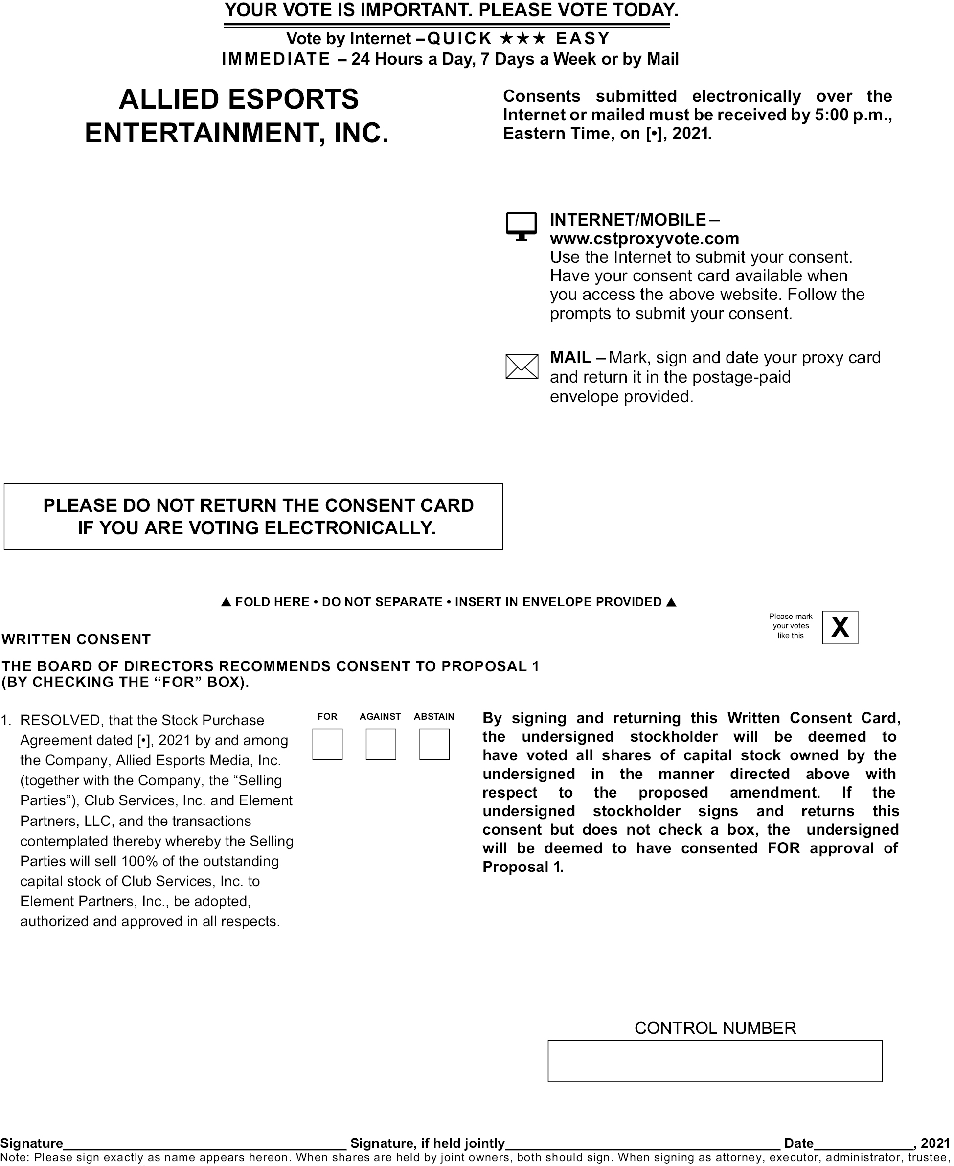 YOUR VOTE IS IMPORTANT. PLEASE VOTE TODAY. Vote by Internet - QUICK EASY IMMEDIATE - 24 Hours a Day, 7 Days a Week or by Mail ALLIED ESPORTSENTERTAINMENT, INC. PLEASE Consents submitted electronically over the Internet or mailed must be received by 5:00 p.m., Eastern Time, on [•], 2021. INTERNET/MOBILE – www.cstproxyvote.com Use the Internet to submit your consent. Have your consent card available when you access the above website. Follow the prompts to submit your consent. MAIL – Mark, sign and date your proxy card and return it in the postage-paid envelope provided. PLEASE DO NOT RETURN THE CONSENT CARDIF YOU ARE VOTING ELECTRONICALLY. FOLD HERE • DO NOT SEPARATE • INSERT IN ENVELOPE PROVIDED Please mark your votes like this WRITTEN CONSENT THE BOARD OF DIRECTORS RECOMMENDS CONSENT TO PROPOSAL 1(BY CHECKING THE “FOR” BOX). 1. RESOLVED, that the Stock Purchase Agreement dated [•], 2021 by and among the Company, Allied Esports Media, Inc. (together with the Company, the “Selling Parties”), Club Services, Inc. and Element Partners, LLC, and the transactionscontemplated thereby whereby the Selling Parties will sell 100% of the outstanding capital stock of Club Services, Inc. to Element Partners, Inc., be adopted, authorized and approved in all respects. FOR AGAINST ABSTAIN By signing and returning this Written Consent Card, the undersigned stockholder will be deemed to have voted all shares of capital stock owned by theundersigned in the manner directed above withrespect to the proposed amendment. If theundersigned stockholder signs and returns thisconsent but does not check a box, the undersigned will be deemed to have consented FOR approval of Proposal 1. CONTROL NUMBER Signature Signature, if held jointly Date , 2021 Note: Please sign exactly as name appears hereon. When shares are held by joint owners, both should sign. When signing as attorney, executor, administrator, trustee, guardian, or corporate officer, please give title as such.