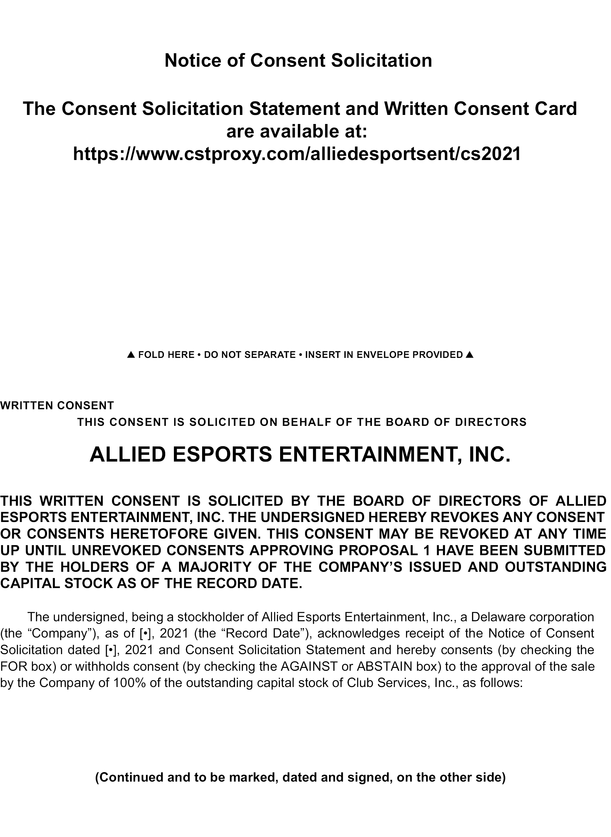 Notice of Consent Solicitation The Consent Solicitation Statement and Written Consent Card are available at: https://www.cstproxy.com/alliedesportsent/cs2021 ▼ FOLD HERE • DO NOT SEPARATE • INSERT IN ENVELOPE PROVIDED ▼ WRITTEN CONSENT THIS CONSENT IS SOLICITED ON BEHALF OF THE BOARD OF DIRECTORS ALLIED ESPORTS ENTERTAINMENT, INC. THIS WRITTEN CONSENT IS SOLICITED BY THE BOARD OF DIRECTORS OF ALLIED ES-PORTS ENTERTAINMENT, INC. THE UNDERSIGNED HEREBY REVOKES ANY CONSENT OR CONSENTS HERETOFORE GIVEN. THIS CONSENT MAY BE REVOKED AT ANY TIME UP UNTIL UNREVOKED CONSENTS APPROVING PROPOSAL 1 HAVE BEEN SUBMITTED BY THE HOLD-ERS OF A MAJORITY OF THE COMPANY’S ISSUED AND OUTSTANDING CAPITAL STOCK AS OF THE RECORD DATE. The undersigned, being a stockholder of Allied Esports Entertainment, Inc., a Delaware corporation (the “Company”), as of [•], 2021 (the “Record Date”), acknowledges receipt of the Notice of Consent Solicitation dat-ed [•], 2021 and Consent Solicitation Statement and hereby consents (by checking the FOR box) or withholds consent (by checking the AGAINST or ABSTAIN box) to the approval of the sale by the Company of 100% of the outstanding capital stock of Club Services, Inc., as follows: (Continued and to be marked, dated and signed, on the other side)