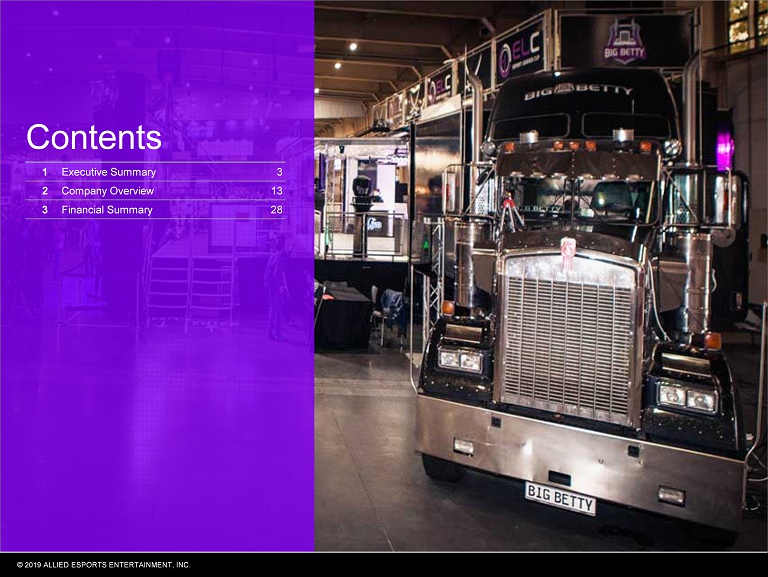01 Insert divider title 3 A Insert divider title 7 Contents Contents © 2019 ALLIED ESPORTS ENTERTAINMENT, INC. 1 Executive Summary 3 2 Company Overview 13 3 Financial Summary 28