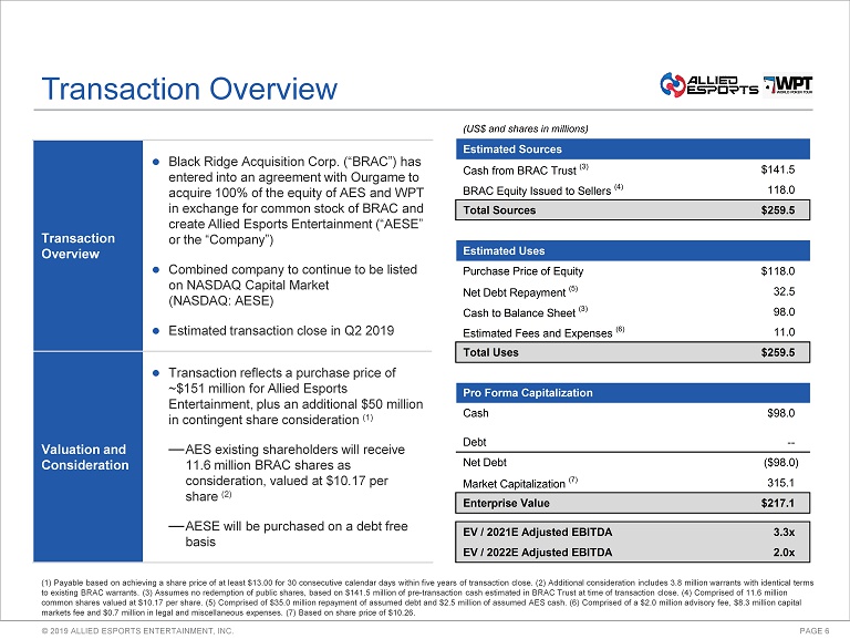 PAGE 5 © 2019 ALLIED ESPORTS ENTERTAINMENT, INC. Transaction presents a unique esports opportunity for investors (1) $50 million in contingent consideration, payable based on achieving a share price of at least $13.00 for 30 consecutive c ale ndar days within five years of transaction close. Investment Thesis Large and Rapidly Growing Addressable Market -2.4 billion gamers globally -Esports viewership growing at 13.0% CAGR through 2022E Strategic Value to SPAC Transaction -Lyle Berman and SPAC team bring decades of gaming and public company experience -SPAC trust capital and NASDAQ listing will accelerate first mover advantage with global reach from property network -100% equity roll - over from AES and WPT shareholders, with significant deferred shares in earn - out (1) Compelling S trategy Creates Long Lasting Platform with Barriers to Entry -In - Person Experiences, Multi - Platform Content and Interactive Services (online platform) drive consumers into Company ecosystem -High incremental margin results in Adjusted EBITDA of $8.7 million in 2020E; FCF positive by mid - 2020E including growth capital expenditures -Brand is synonymous with esports , creating a barrier to entry around Company platform -Strategy and proof points from 17 years of experience with WPT, but in a larger, faster growth market Attractive Valuation and Conservative Capital Structure -3.3x 2021E Adjusted EBITDA; 2.0x 2022E Adjusted EBITDA -Zero debt on balance sheet at close with sufficient capital to scale business up to $ 307 million in revenue by 2022E -New online platform, CENTER, is launching in 2020E, providing significant upside to current valuation In - Person Experiences Multi - Platform Content Interactive Services