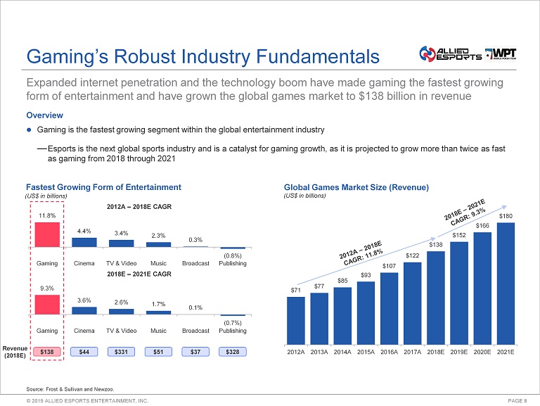 PAGE 7 © 2019 ALLIED ESPORTS ENTERTAINMENT, INC. AESE Board and Management Team Board of Directors (1) Management Team Lyle Berman AESE: Chairman BRAC: Director -Sits on the Board of Golden Entertainment (NASDAQ:GDEN) -Formerly Chairman and CEO of Lakes Entertainment prior to its 2015 merger with Golden Entertainment Eric Yang AESE: Vice - Chairman Ourgame: Co - Chief Executive Officer, Chairman -Joined Ourgame in 2011 -Formerly Partner at IBM -Holds an EMBA from the Cheung Kong Graduate School of Business Frank Ng AESE: Chief Executive Officer Ourgame: Co - Chief Executive Officer -Joined Ourgame in 2004, founded Allied Esports in 2015 -Formerly Chief Commercial Officer, PCCW Skyhorse; founder & CEO, Show8 Group Ken DeCubellis AESE: Chief Financial Officer BRAC: Chief Executive Officer, Chairman -Took BRAC public in October 2017 -CEO of Black Ridge Oil & Gas (OTC:ANFC), various management roles at Exxon Mobil -Holds an MBA from the Kellogg School of Management at Northwestern University Adam Pliska World Poker Tour: Chief Executive Officer, President -Joined WPT in 2003 -Holds a JD from the University of California, Berkeley Jud Hannigan Allied Esport s : Chief Executive Officer -Joined Ourgame in 2015; Co - Founder of Allied Esports -CEO of Allied Esports since February 2017 David Moon Ourgame: President -Joined Ourgame in 2018 to lead Global Business -Formerly VP, Disney Interactive; co - founder & CEO, StudioEx; Head of Corp. Dev., NHN BRAC Ourgame (1) Board will be comprised of 11 directors.