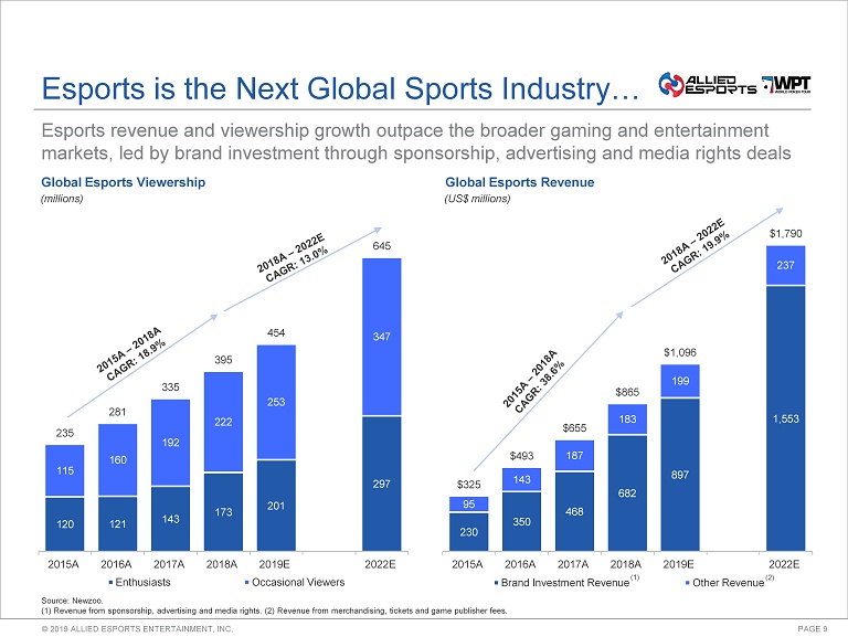 PAGE 8 © 2019 ALLIED ESPORTS ENTERTAINMENT, INC. 9.3% 3.6% 2.6% 1.7% 0.1% (0.7%) Gaming Cinema TV & Video Music Broadcast Publishing 11.8% 4.4% 3.4% 2.3% 0.3% (0.8%) Gaming Cinema TV & Video Music Broadcast Publishing $71 $77 $85 $93 $107 $122 $138 $152 $166 $180 2012A 2013A 2014A 2015A 2016A 2017A 2018E 2019E 2020E 2021E Source: Frost & Sullivan and Newzoo . Gaming’s Robust Industry Fundamentals Overview Global Games Market Size (Revenue) Fastest Growing Form of Entertainment -Gaming is the fastest growing segment within the global entertainment industry — Esports is the next global sports industry and is a catalyst for gaming growth, as it is projected to grow more than twice as fa st as gaming from 2018 through 2021 Revenue ( 2018E) $ 138 (US$ in billions) $ 44 $ 331 $ 51 $37 $328 Expanded internet penetration and the technology boom have made gaming the fastest growing form of entertainment and have grown the global games market to $ 138 billion in revenue 2012A – 2018E CAGR 2018E – 2021E CAGR (US$ in billions)