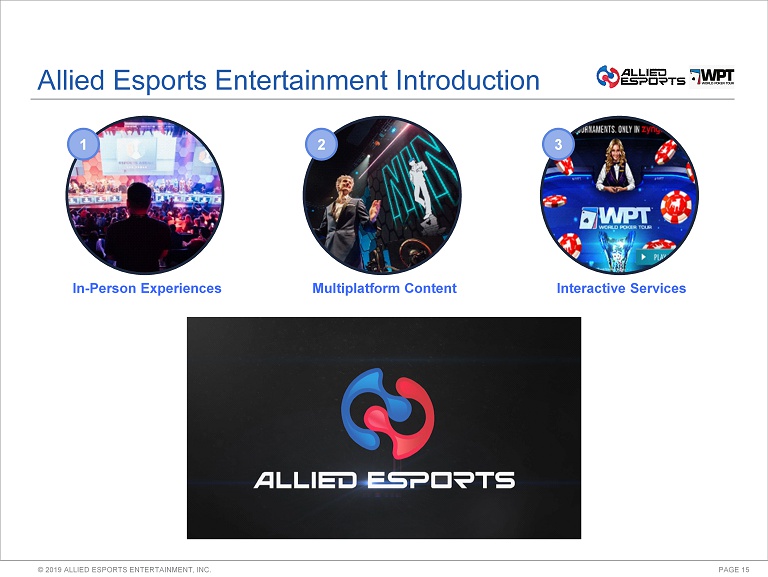 PAGE 14 © 2019 ALLIED ESPORTS ENTERTAINMENT, INC. Evolution of the World Poker Tour -In May 2002, launched the inaugural tour with the Five Diamond World Poker Classic at the Bellagio in Las Vegas, featuring a $1.4 million prize pool -Has since expanded to an 11 event global main tour and dozens of additional events across four continents -Has awarded over $1 billion in prize monies to date -In 2008, launched ClubWPT – an online subscription platform catering to the ecology of poker enthusiasts -Has since introduced several interactive offerings, including the 2016 launch of PlayWPT – a social casino platform -In 2018, announced a multi - year partnership to host WPT - themed tournaments on the Zynga Poker platform In - Person Experiences Interactive Services Multiplatform Content 1 2 3 -First televised on the Travel Channel in 2003 for a 15 episode run -16 successful seasons across a host of networks including Fox Sports, where the show currently presides -Broadcast is distributed globally in 25 countries and territories