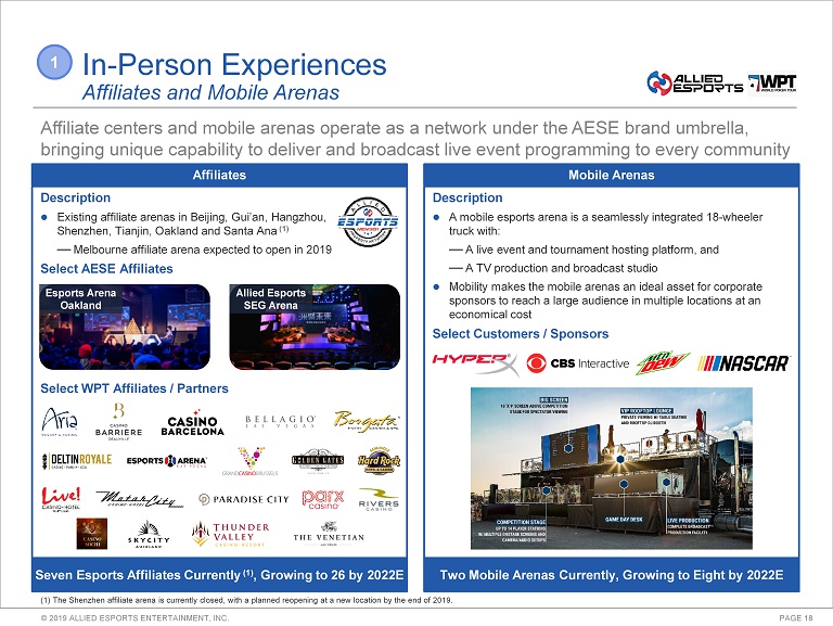 PAGE 17 © 2019 ALLIED ESPORTS ENTERTAINMENT, INC. Allied Esports’ flagship property is state - of - the - art and provides fans a more intimate and interactive experience compared to other arena formats Primary Sport(s) N/A Esports Basketball / Hockey Primary Team(s) None None Max Capacity 500 (1) 1,500 20,789 Plug and Play Esports Live Event - x - Plug and Play Streaming - x - Fan Interaction (Play) x x - Open Daily - x - Community Authenticity - x - Recent Esports Event Brawlhalla World Championship 2018 Ninja Vegas ‘18 League of Legends World Championships Semifinals ‘16 In - Person Experiences Purpose - Built Esports Arena 1 (1) Reflects estimated capacity for Brawlhalla esports event, though venue does have capability of hosting events with capaci ty up to 3,600.