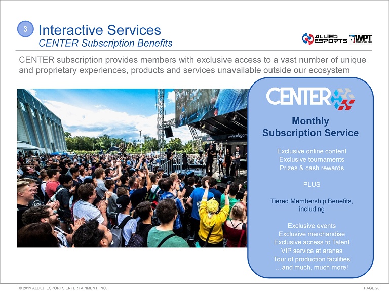 PAGE 26 © 2019 ALLIED ESPORTS ENTERTAINMENT, INC. 3 Interactive Services CENTER Subscription Benefits Monthly Subscription Service Exclusive online content Exclusive tournaments Prizes & cash rewards PLUS Tiered Membership Benefits, including Exclusive events Exclusive merchandise Exclusive access to Talent VIP service at arenas Tour of production facilities …and much, much more! CENTER subscription provides members with exclusive access to a vast number of unique and proprietary experiences, products and services unavailable outside our ecosystem