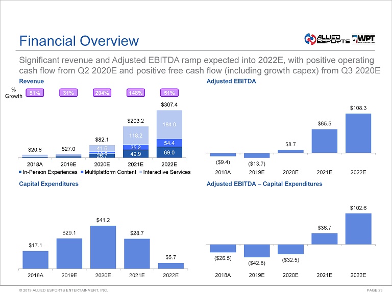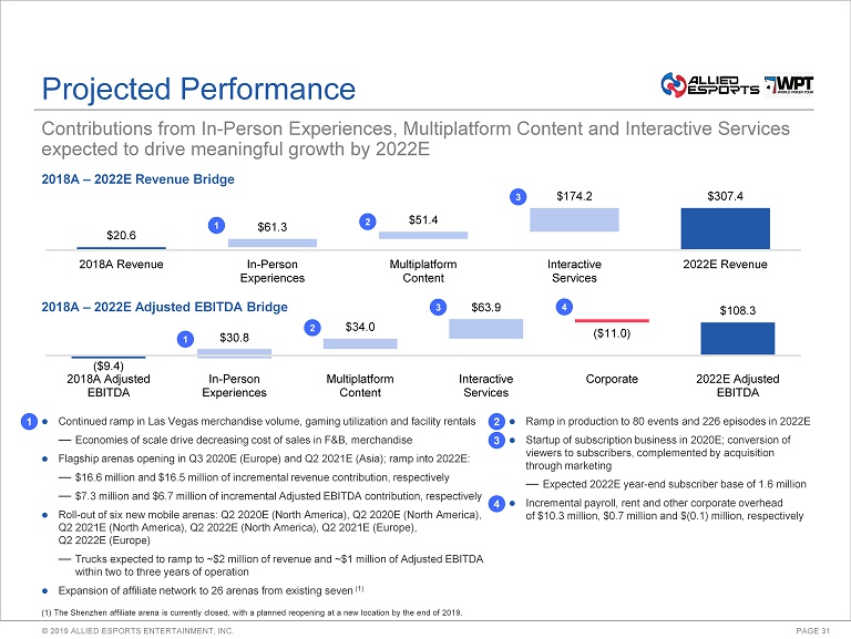 © 2019 ALLIED ESPORTS ENTERTAINMENT, INC. $20.6 $61.3 $51.4 $174.2 $307.4 2018A Revenue In - Person Experiences Multiplatform Content Interactive Services 2022E Revenue ($9.4) $30.8 $34.0 $63.9 ($11.0) $108.3 2018A Adjusted EBITDA In - Person Experiences Multiplatform Content Interactive Services Corporate 2022E Adjusted EBITDA 2018A – 2022E Revenue Bridge Projected Performance 1 2 3 -Continued ramp in Las Vegas merchandise volume, gaming utilization and facility rentals — Economies of scale drive decreasing cost of sales in F&B, merchandise -Flagship arenas opening in Q3 2020E (Europe) and Q2 2021E (Asia); ramp into 2022E: — $16.6 million and $16.5 million of incremental revenue contribution, respectively — $7.3 million and $6.7 million of incremental Adjusted EBITDA contribution, respectively -Roll - out of six new mobile arenas: Q2 2020E (North America), Q2 2020E (North America), Q2 2021E (North America), Q2 2022E (North America), Q2 2021E (Europe), Q2 2022E (Europe) — Trucks expected to ramp to ~$ 2 million of revenue and ~$ 1 million of Adjusted EBITDA within two to three years of operation -Expansion of affiliate network to 26 arenas from existing seven (1) 1 3 4 2 Contributions from In - Person Experiences, Multiplatform Content and Interactive Services expected to drive meaningful growth by 2022E 2018A – 2022E Adjusted EBITDA Bridge 1 2 3 4 -Ramp in production to 80 events and 226 episodes in 2022E -Startup of subscription business in 2020E; conversion of viewers to subscribers, complemented by acquisition through marketing — Expected 2022E year - end subscriber base of 1.6 million -Incremental payroll, rent and other corporate overhead of $10.3 million, $0.7 million and $(0.1) million, respectively (1) The Shenzhen affiliate arena is currently closed, with a planned reopening at a new location by the end of 2019 .