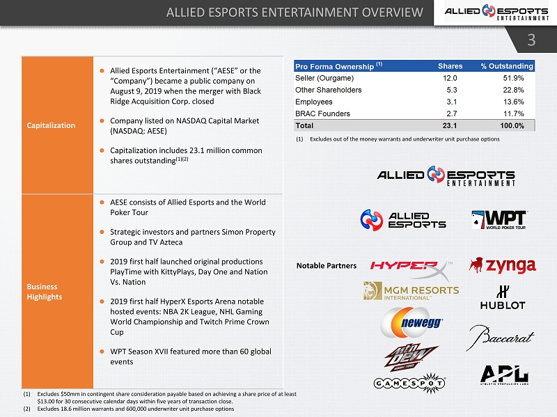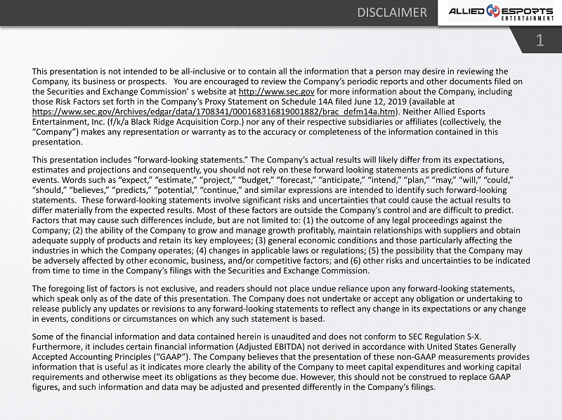 1 DISCLAIMER This presentation is not intended to be all - inclusive or to contain all the information that a person may desire in reviewing the Company, its business or prospects . You are encouraged to review the Company’s periodic reports and other documents filed on the Securities and Exchange Commission’ s website at http://www.sec.gov for more information about the Company, including those Risk Factors set forth in the Company’s Proxy Statement on Schedule 14A filed June 12, 2019 (available at https://www.sec.gov/Archives/edgar/data/1708341/000168316819001882/brac_defm14a.htm ). Neither Allied Esports Entertainment, Inc. (f/k/a Black Ridge Acquisition Corp.) nor any of their respective subsidiaries or affiliates (collectively, the “Company”) makes any representation or warranty as to the accuracy or completeness of the information contained in this presentation . This presentation includes “forward - looking statements.” The Company’s actual results will likely differ from its expectations, estimates and projections and consequently, you should not rely on these forward looking statements as predictions of future events. Words such as “expect,” “estimate,” “project,” “budget,” “forecast,” “anticipate,” “intend,” “plan,” “may,” “will,” “ cou ld,” “should,” “believes,” “predicts,” “potential,” “continue,” and similar expressions are intended to identify such forward - looking statements. These forward - looking statements involve significant risks and uncertainties that could cause the actual results to differ materially from the expected results. Most of these factors are outside the Company’s control and are difficult to predict. Factors that may cause such differences include, but are not limited to: (1) the outcome of any legal proceedings against the Company ; (2) the ability of the C ompany to grow and manage growth profitably, maintain relationships with suppliers and obtain adequate supply of products and retain its key employees; ( 3 ) general economic conditions and those particularly affecting the industries in which the Company operates; (4) changes in applicable laws or regulations; ( 5 ) the possibility that the C ompany may be adversely affected by other economic, business, and/or competitive factors; and ( 6 ) other risks and uncertainties to be indicated from time to time in the Company’s filings with the Securities and Exchange Commission. T he foregoing list of factors is not exclusive , and r eaders should not place undue reliance upon any forward - looking statements, which speak only as of the date of this presentation . The Company does not undertake or accept any obligation or undertaking to release publicly any updates or revisions to any forward - looking statements to reflect any change in its expectations or any cha nge in events, conditions or circumstances on which any such statement is based. Some of the financial information and data contained herein is unaudited and does not conform to SEC R egulation S - X. Furthermore, it includes certain financial information (Adjusted EBITDA) not derived in accordance with United States General ly Accepted Accounting Principles (“GAAP”). The Company believe s that the presentation of these non - GAAP measurements provides information that is useful as it indicates more clearly the ability of the Company to meet capital expenditures and working capital requirements and otherwise meet its obligation s as they become due. However, this should not be construed to replace GAAP figures , and such information and data may be adjusted and presented differently in the Company’s filings.