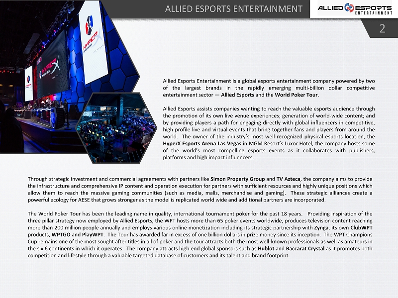 2 Allied Esports Entertainment is a global esports entertainment company powered by two of the largest brands in the rapidly emerging multi - billion dollar competitive entertainment sector — Allied Esports and the World Poker Tour . Allied Esports assists companies wanting to reach the valuable esports audience through the promotion of its own live venue experiences ; generation of world - wide content ; and by providing players a path for engaging directly with global influencers in competitive, high profile live and virtual events that bring together fans and players from around the world . The owner of the industry’s most well - recognized physical esports location, the HyperX Esports Arena Las Vegas in MGM Resort’s Luxor Hotel, the company hosts some of the world’s most compelling esports events as it collaborates with publishers, platforms and high impact influencers . Through strategic investment and commercial agreements with partners like Simon Property Group and TV Azteca , the company aims to provide the infrastructure and comprehensive IP content and operation execution for partners with sufficient resources and highly unique positions which allow them to reach the massive gaming communities (such as media, malls, merchandise and gaming) . These strategic alliances create a powerful ecology for AESE that grows stronger as the model is replicated world wide and additional partners are incorporated . The World Poker Tour has been the leading name in quality, international tournament poker for the past 18 years . Providing inspiration of the three pillar strategy now employed by Allied Esports, the WPT hosts more than 65 poker events worldwide, produces television content reaching more than 200 million people annually and employs various online monetization including its strategic partnership with Zynga , its own ClubWPT products, WPTGO and PlayWPT . The Tour has awarded far in excess of one billion dollars in prize money since its inception . The WPT Champions Cup remains one of the most sought after titles in all of poker and the tour attracts both the most well - known professionals as well as amateurs in the six 6 continents in which it operates . The company attracts high end global sponsors such as Hublot and Baccarat Crystal as it promotes both competition and lifestyle through a valuable targeted database of customers and its talent and brand footprint . ALLIED ESPORTS ENTERTAINMENT