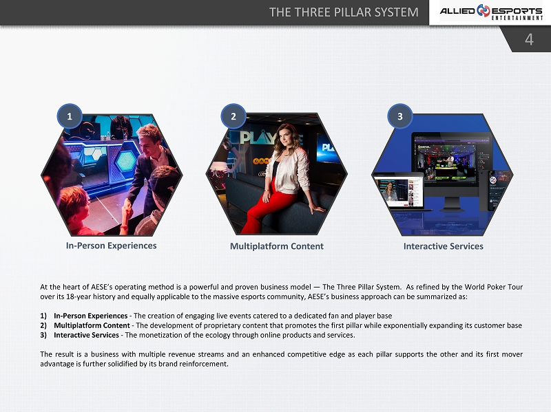 4 THE THREE PILLAR SYSTEM In - Person Experiences 1 Multiplatform Content 2 Interactive Services 3 At the heart of AESE’s operating method is a powerful and proven business model — The Three Pillar System . As refined by the World Poker Tour over its 18 - year history and equally applicable to the massive esports community, AESE’s business approach can be summarized as : 1) In - Person Experiences - The creation of engaging live events catered to a dedicated fan and player base 2) Multiplatform Content - T he development of proprietary content that promotes the first pillar while exponentially expanding its customer base 3) Interactive Services - T he monetization of the ecology through online products and services . The result is a business with multiple revenue streams and an enhanced competitive edge as each pillar supports the other and its first mover advantage is further solidified by its brand reinforcement .