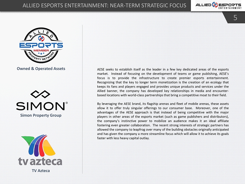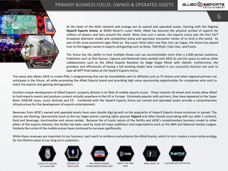 5 ALLIED ESPORTS ENTERTAINMENT: NEAR - TERM STRATEGIC FOCUS AESE seeks to establish itself as the leader in a few key dedicated areas of the esports market . Instead of focusing on the development of teams or game publishing, AESE’s focus is to provide the infrastructure to create premier esports entertainment . Recognizing that the key to longer term monetization is the creation of an ecology that keeps its fans and players engaged and provides unique products and services under the Allied banner, the company has developed key relationships in media and encounter - based locations with world - class partnerships that bring a competitive moat to their field . By leveraging the AESE brand, its flagship arenas and fleet of mobile arenas, these assets allow it to offer truly singular offerings to our consumer base . Moreover, one of the advantages of the AESE approach is that instead of being competitive with the major players in other areas of the esports market (such as game publishers and distributors), the company’s instinctive power to mobilize an audience makes it an ideal affiliate fostering even greater collaboration . The recent strong interests of strategic partners has allowed the company to leapfrog over many of the building obstacles originally anticipated and has given the company a more streamline focus which will allow it to achieve its goals faster with less heavy capital outlay . TV Azteca Simon Property Group Owned & Operated Assets