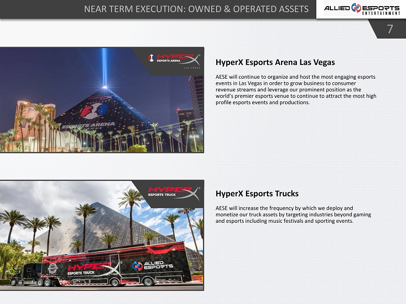 6 PRIMARY BUSINESS FOCUS: OWNED & OPERATED ASSETS At the heart of the AESE network and ecology are its owned and operated assets . Starting with the flagship HyperX Esports Arena , at MGM Resort’s Luxor Hotel, Allied has become the physical symbol of esports for millions of players and fans around the world . More than just a venue, the esports arena was the first 24 / 7 broadcast television studio and competitive arena and spectator encounter center of its kind in the world . As one of the most prominent signs fixed on the Luxor Hotel when one flies into Las Vegas, the Arena has played host to the biggest names in esports and gaming such as Ninja, TSM Myth , FaZe Clan, and Fnatic . The Arena has the ability to host multiple shows and can accommodate more than a 1 , 000 person audience . Publishers such as Riot Games, Capcom and Nintendo have worked with AESE to use the space as well as other collaborations such as t he Allied Esports Rainbow Six Siege Vegas Minor with Ubisoft . Furthermore, the grandeur and efficiencies of having a full working studio have resulted in our successful decision last year to tape all WPT final tables at the HyperX Esports Arena . The arena also allows AESE to create Pillar 2 programming that can be immediately sent to affiliates such as TV Azteca and other regional partners we anticipate in the future, all while promoting the Allied Esports brand and providing high value sponsorship opportunities for companies who wish to reach the esports and gaming demographics . Another unique development of Allied Esports’ property division is its fleet of mobile esports trucks . These massive 18 - wheel semi trucks allow Allied to hold esports events and produce content virtually anywhere in the US or Europe . Extremely popular with partners, they have appeared at the Super Bowl, NASCAR races, music festivals and E 3 . Combined with the HyperX Esports Arena our owned and operated assets provide a comprehensive infrastructure for the development of esports entertainment . Revenues from AESE’s owned and operated assets have seen double digit growth as the popularity of HyperX Esports Arena continues to spread . The sources are Gaming, Sponsorship (such as the Las Vegas arena’s naming rights sponsor HyperX and other brands associating with our pillar 2 content), food and beverage, merchandise and venue rentals . Because the of iconic nature of the facility and AESE’s complimentary business model to other pillars of the esports industry, the facility has been used by most all major publishers and organizations such as the NBA and National Hockey League . Similarly the rental of the mobile arenas have continued to increase significantly . While these revenues are important to our business, each work to reinforce and enhance the Allied brands, which in turn creates a more sticky ecology for the lifetime value of our long term customers . LEAGUE OF LEGENDS ALL STARS 2018 CAPCOM CUP 2018 & 2019 NHL WORLD GAMING CHAMPIONSHIP 2018 & 2019 NBA2K: THE TURN 2019 NINJA VEGAS ‘18 PLAYTIME WITH KITTYPLAYS
