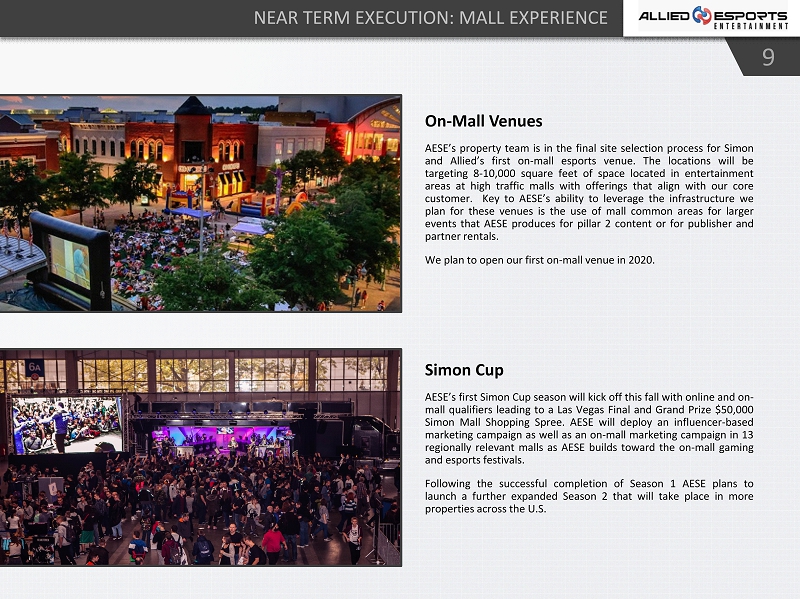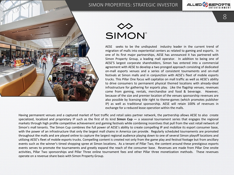 8 SIMON PROPERTIES: STRATEGIC INVESTOR AESE seeks to be the undisputed industry leader in the current trend of migration of malls into experiential centers as related to gaming and esports . In one of its first major partnerships, AESE has announced it has partnered with Simon Property Group, a leading mall operator . In addition to being one of AESE’S largest corporate shareholders, Simon has entered into a commercial agreement with AESE to develop a two pronged approach consisting of dedicated on - mall esports venues and a series of consistent tournaments and on - mall festivals at Simon malls and in conjunction with AESE’s fleet of mobile esports trucks . This Pillar One focus will capitalize on mall traffic as well as AESE’s ability to drive consumers to permanent physical themed locations with already - ideal infrastructure for gathering for esports play . Like the flagship venues, revenues come from gaming, rentals, merchandise and food & beverage . However, because of the size and premier location of the venues sponsorship revenues are also possible by licensing title right to theme - games (which promotes publisher IP) as well as traditional sponsorship . AESE will retain 100 % of revenues in exchange for a reduced lease operation within the malls . Having permanent venues and a captured market of foot traffic and retail sales partner network, the partnership allows AESE to also create specialized, localized and proprietary IP such as the first of its kind Simon Cup — a seasonal tournament series that engages the regional markets through high profile competitive achievement and gaming festivals while combining incentives that pull from the vast retail network of Simon’s mall tenants . The Simon Cup combines the full power of AESE’s ability to create compelling IP and mobilize its esport consumer base, with the power of an infrastructure that only the largest mall chains in America can provide . Regularly scheduled tournaments are promoted throughout the malls and are played online to capture the largest regional audience playing down to one of several Simon playoff locations and utilizing AESE’s fleet of mobile esports trucks . Compelling content is created not only from the game play and festival footage but from ancillary events such as the winner’s timed shopping spree at Simon locations . As a tenant of Pillar Two, the content around these prestigious esports events serves to promote the tournaments and greatly expand the reach of the consumer base . Revenues are made from Pillar One onsite activities, Pillar Two sponsorships and Pillar Three online tournament fees and other Pillar three monetization methods . These revenues operate on a revenue share basis with Simon Property Group .
