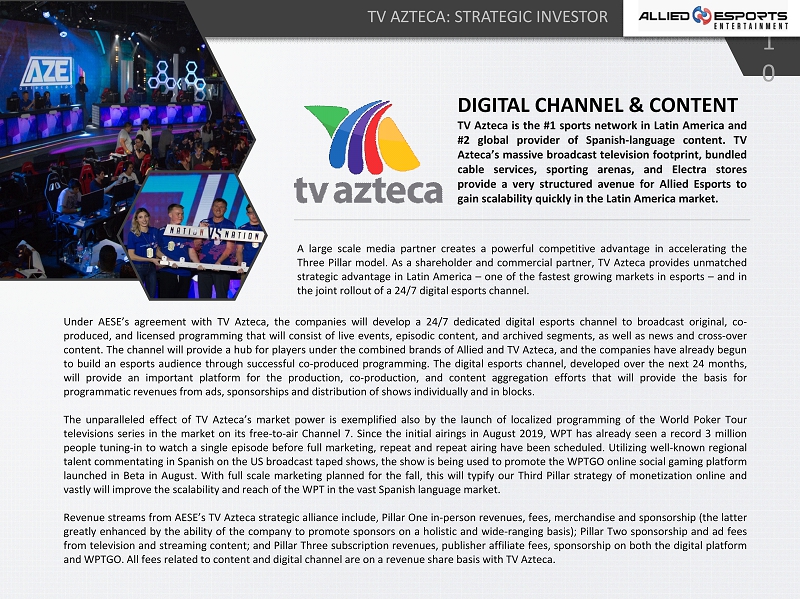 1 0 TV AZTECA: STRATEGIC INVESTOR A large scale media partner creates a powerful competitive advantage in accelerating the Three Pillar model . As a shareholder and commercial partner, TV Azteca provides unmatched strategic advantage in Latin America – one of the fastest growing markets in esports – and in the joint rollout of a 24 / 7 digital esports channel . Under AESE’s agreement with TV Azteca, the companies will develop a 24 / 7 dedicated digital esports channel to broadcast original, co - produced, and licensed programming that will consist of live events, episodic content, and archived segments, as well as news and cross - over content . The channel will provide a hub for players under the combined brands of Allied and TV Azteca, and the companies have already begun to build an esports audience through successful co - produced programming . The digital esports channel, developed over the next 24 months, will provide an important platform for the production, co - production, and content aggregation efforts that will provide the basis for programmatic revenues from ads, sponsorships and distribution of shows individually and in blocks . The unparalleled effect of TV Azteca’s market power is exemplified also by the launch of localized programming of the World Poker Tour televisions series in the market on its free - to - air Channel 7 . Since the initial airings in August 2019 , WPT has already seen a record 3 million people tuning - in to watch a single episode before full marketing, repeat and repeat airing have been scheduled . Utilizing well - known regional talent commentating in Spanish on the US broadcast taped shows, the show is being used to promote the WPTGO online social gaming platform launched in Beta in August . With full scale marketing planned for the fall, this will typify our Third Pillar strategy of monetization online and vastly will improve the scalability and reach of the WPT in the vast Spanish language market . Revenue streams from AESE’s TV Azteca strategic alliance include, Pillar One in - person revenues, fees, merchandise and sponsorship (the latter greatly enhanced by the ability of the company to promote sponsors on a holistic and wide - ranging basis) ; Pillar Two sponsorship and ad fees from television and streaming content ; and Pillar Three subscription revenues, publisher affiliate fees, sponsorship on both the digital platform and WPTGO . All fees related to content and digital channel are on a revenue share basis with TV Azteca . DIGITAL CHANNEL & CONTENT TV Azteca is the # 1 sports network in Latin America and # 2 global provider of Spanish - language content . TV Azteca’s massive broadcast television footprint, bundled cable services, sporting arenas, and Electra stores provide a very structured avenue for Allied Esports to gain scalability quickly in the Latin America market .