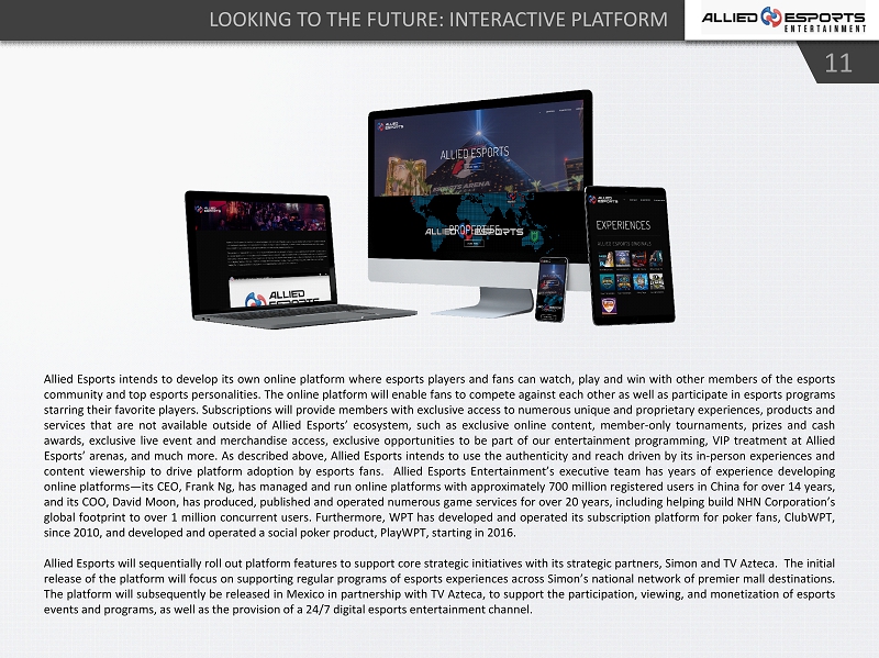 11 LOOKING TO THE FUTURE: INTERACTIVE PLATFORM Allied Esports intends to develop its own online platform where esports players and fans can watch, play and win with other members of the esports community and top esports personalities . The online platform will enable fans to compete against each other as well as participate in esports programs starring their favorite players . Subscriptions will provide members with exclusive access to numerous unique and proprietary experiences, products and services that are not available outside of Allied Esports’ ecosystem, such as exclusive online content, member - only tournaments, prizes and cash awards, exclusive live event and merchandise access, exclusive opportunities to be part of our entertainment programming, VIP treatment at Allied Esports’ arenas, and much more . As described above, Allied Esports intends to use the authenticity and reach driven by its in - person experiences and content viewership to drive platform adoption by esports fans . Allied Esports Entertainment’s executive team has years of experience developing online platforms — its CEO, Frank Ng, has managed and run online platforms with approximately 700 million registered users in China for over 14 years, and its COO, David Moon, has produced, published and operated numerous game services for over 20 years, including helping build NHN Corporation’s global footprint to over 1 million concurrent users . Furthermore, WPT has developed and operated its subscription platform for poker fans, ClubWPT , since 2010 , and developed and operated a social poker product, PlayWPT , starting in 2016 . Allied Esports will sequentially roll out platform features to support core strategic initiatives with its strategic partners, Simon and TV Azteca . The initial release of the platform will focus on supporting regular programs of esports experiences across Simon’s national network of premier mall destinations . The platform will subsequently be released in Mexico in partnership with TV Azteca, to support the participation, viewing, and monetization of esports events and programs, as well as the provision of a 24 / 7 digital esports entertainment channel .
