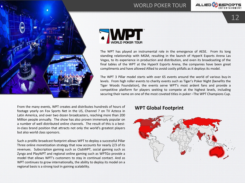 12 The WPT 3 Pillar model starts with over 65 events around the world of various buy - in levels . From high roller events to charity events such as Tiger’s Poker Night (benefits the Tiger Woods Foundation), the events serve WPT’s most ardent fans and provide a competitive platform for players seeking to compete at the highest levels, including securing their name on one of the most coveted titles in poker – The WPT Champions Cup . The WPT has played an instrumental role in the emergence of AESE . From its long standing relationship with MGM, resulting in the launch of HyperX Esports Arena Las Vegas, to its experience in production and distribution, and even its broadcasting of the final tables of the WPT at the HyperX Esports Arena, the companies have been great compliments and have allowed Allied to avoid costly pitfalls as it deploys its model . From the many events, WPT creates and distributes hundreds of hours of footage yearly on Fox Sports Net in the US, Channel 7 on TV Azteca in Latin America, and over two dozen broadcasters, reaching more than 200 Million people annually . The show has also proven immensely popular on a number of well distributed online channels . The result of this is a best - in - class brand position that attracts not only the world’s greatest players but also world class sponsors . Such a prolific broadcast footprint allows WPT to deploy a successful Pillar Three online monetization strategy that now accounts for nearly 2 / 3 of its revenues . Subscription gaming such as ClubWPT , social gaming such as Zynga and PlayWPT and regional online gaming such as WPTGo provide a model that allows WPT’s customers to stay in continual contact . And as WPT continues to grow internationally, the ability to deploy its model on a regional basis is a strong tool in gaining scalability . WORLD POKER TOUR WPT Global Footprint