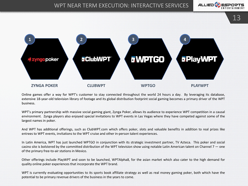 13 WPT NEAR TERM EXECUTION: INTERACTIVE SERVICES ZYNGA POKER 1 2 3 4 CLUBWPT WPTGO PLAYWPT Online games offer a way for WPT’s customer to stay connected throughout the world 24 hours a day . By leveraging its database, extensive 18 - year - old television library of footage and its global distribution footprint social gaming becomes a primary driver of the WPT business . WPT’s primary partnership with massive social gaming giant, Zynga Poker, allows its audience to experience WPT competition in a causal environment . Zynga players also enjoyed special invitations to WPT events in Las Vegas where they have competed against some of the largest names in poker . And WPT has additional offerings, such as ClubWPT . com which offers poker, slots and valuable benefits in addition to real prizes like entrees to WPT events, invitations to the WPT cruise and other in - person talent experiences . In Latin America, WPT has just launched WPTGO in conjunction with its strategic investment partner, TV Azteca . This poker and social casino site is bolstered by the committed distribution of the WPT television show using notable Latin American talent on Channel 7 — one of the primary free - to - air stations in Mexico . Other offerings include PlayWPT and soon to be launched, WPTAlpha 8 , for the asian market which also cater to the high demand for quality online poker experiences that incorporate the WPT brand . WPT is currently evaluating opportunities to its sports book affiliate strategy as well as real money gaming poker, both which have the potential to be primary revenue drivers of the business in the years to come .