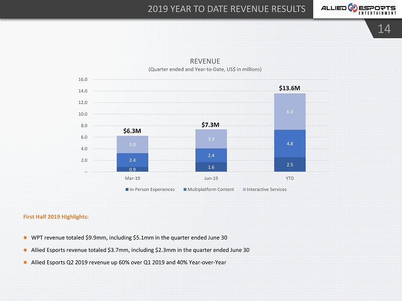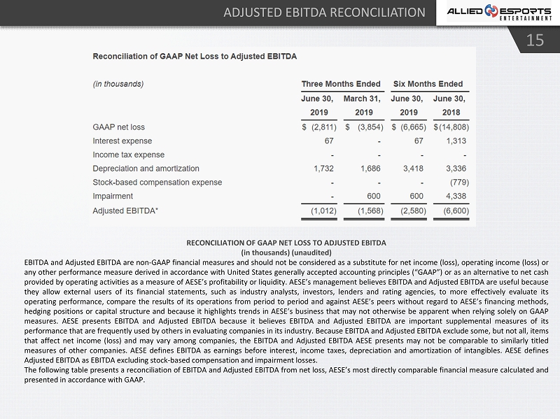 14 2019 YEAR TO DATE REVENUE RESULTS 0.9 1.6 2.5 2.4 2.4 4.8 3.0 3.3 6.3 -- 2.0 4.0 6.0 8.0 10.0 12.0 14.0 16.0 Mar-19 Jun-19 YTD REVENUE (Quarter ended and Year - to - Date, US$ in millions) In-Person Experiences Multiplatform Content Interactive Services First Half 2019 Highlights: WPT revenue totaled $9.9mm, including $5.1mm in the quarter ended June 30 Allied Esports revenue totaled $3.7mm, including $2.3mm in the quarter ended June 30 Allied Esports Q2 2019 revenue up 60% over Q1 2019 and 40% Year - over - Year $6.3M $7.3M $13.6M