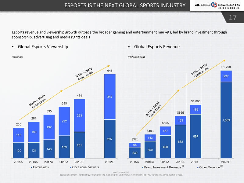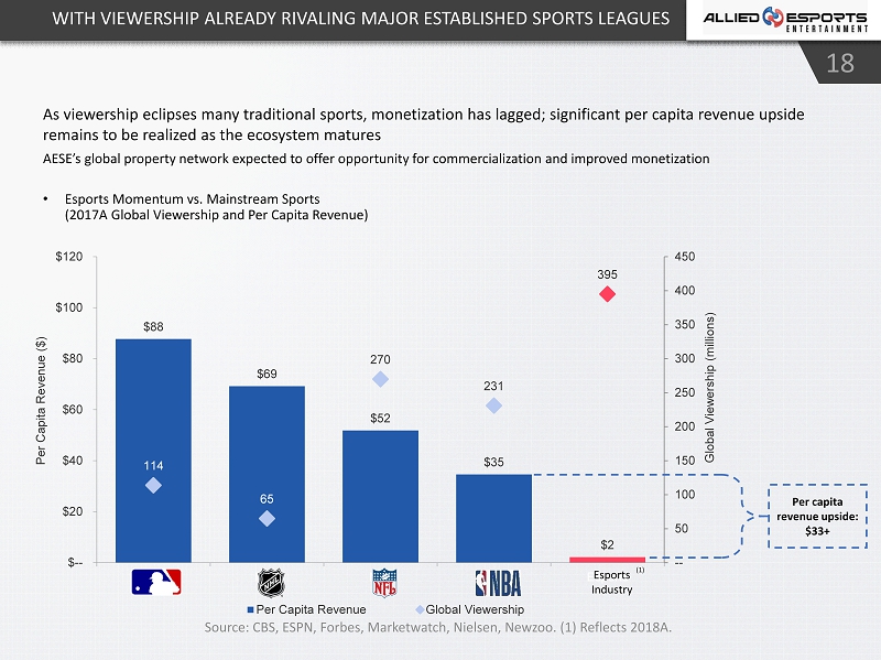 17 ESPORTS IS THE NEXT GLOBAL SPORTS INDUSTRY 230 350 468 682 897 1,553 95 143 187 183 199 237 $325 $493 $655 $865 $1,096 $1,790 2015A 2016A 2017A 2018A 2019E 2022E Brand Investment Revenue Other Revenue 120 121 143 173 201 297 115 160 192 222 253 347 235 281 335 395 454 645 2015A 2016A 2017A 2018A 2019E 2022E Enthusiasts Occasional Viewers Esports revenue and viewership growth outpace the broader gaming and entertainment markets, led by brand investment through sponsorship, advertising and media rights deals Source: Newzoo. (1) Revenue from sponsorship, advertising and media rights. (2) Revenue from merchandising, tickets and game publisher fees. • Global Esports Viewership • Global Esports Revenue (US$ millions) (millions) (2) (1)